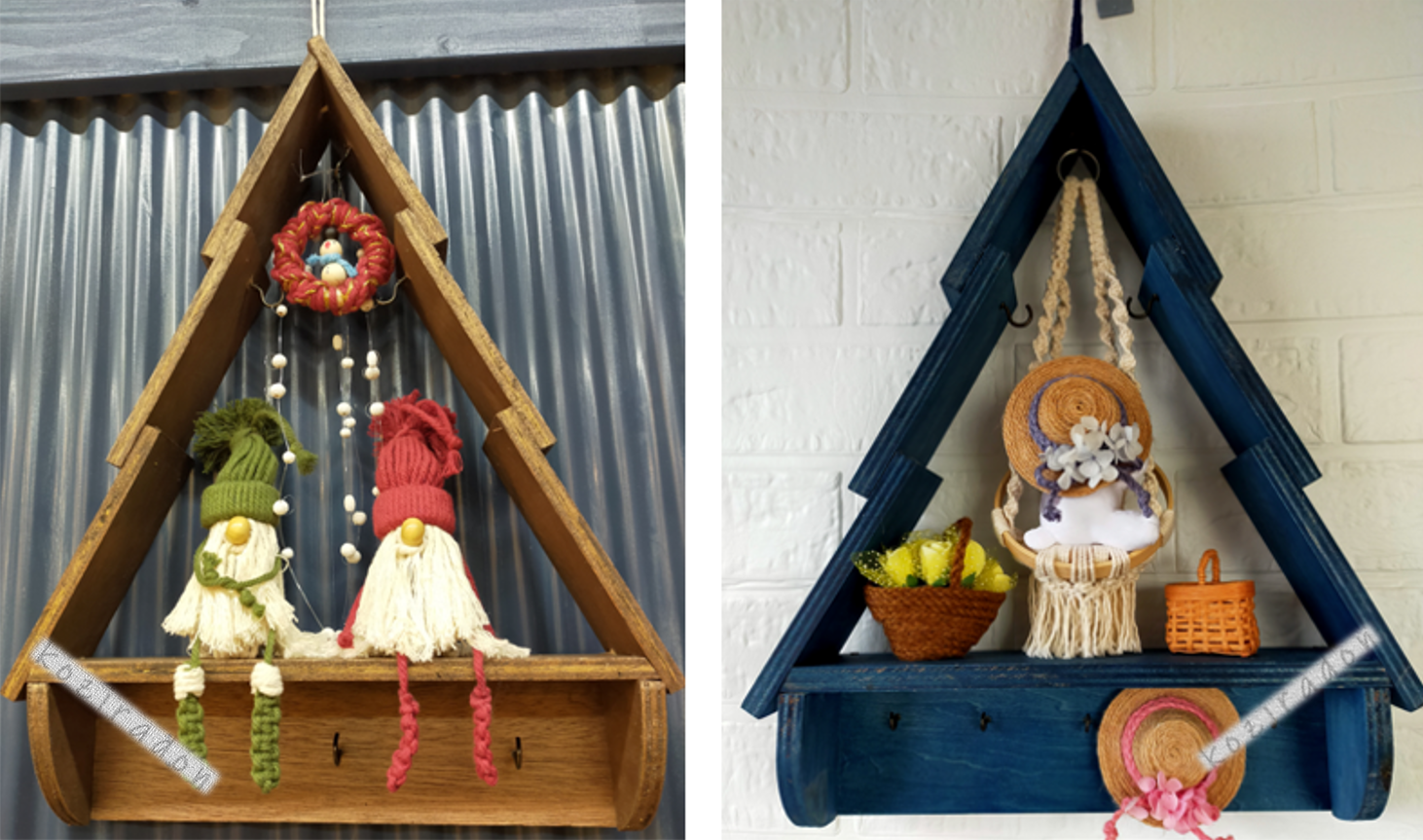 木切れ端材を使ってクリスマス用飾り用に考えましたが、水性ニスで塗る色によってイメージが変わり、飾るものを変えたら年中使えます。